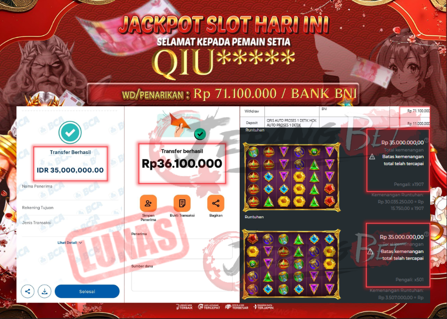 Halaman Bukti Lunas Jackpot bukan sekadar ajang pamer kemenangan, tetapi juga menjadi jaminan kepercayaan bagi semua member. Dengan melihat deretan bukti pembayaran, pemain baru dapat merasa lebih yakin bahwa setiap kemenangan berapapun nominalnya akan dibayarkan 100% tanpa alasan yang mengada-ada. Sementara untuk member lama, ini menjadi motivasi tambahan untuk terus bermain karena terbukti menang berapapun akan di-transfer penuh.