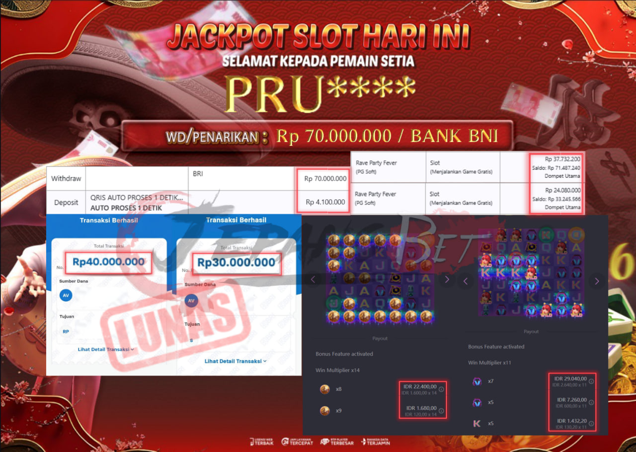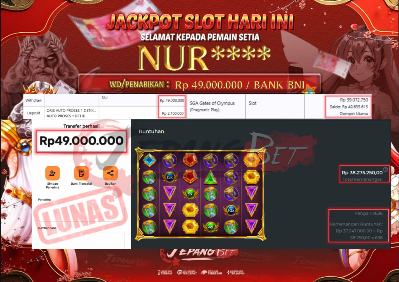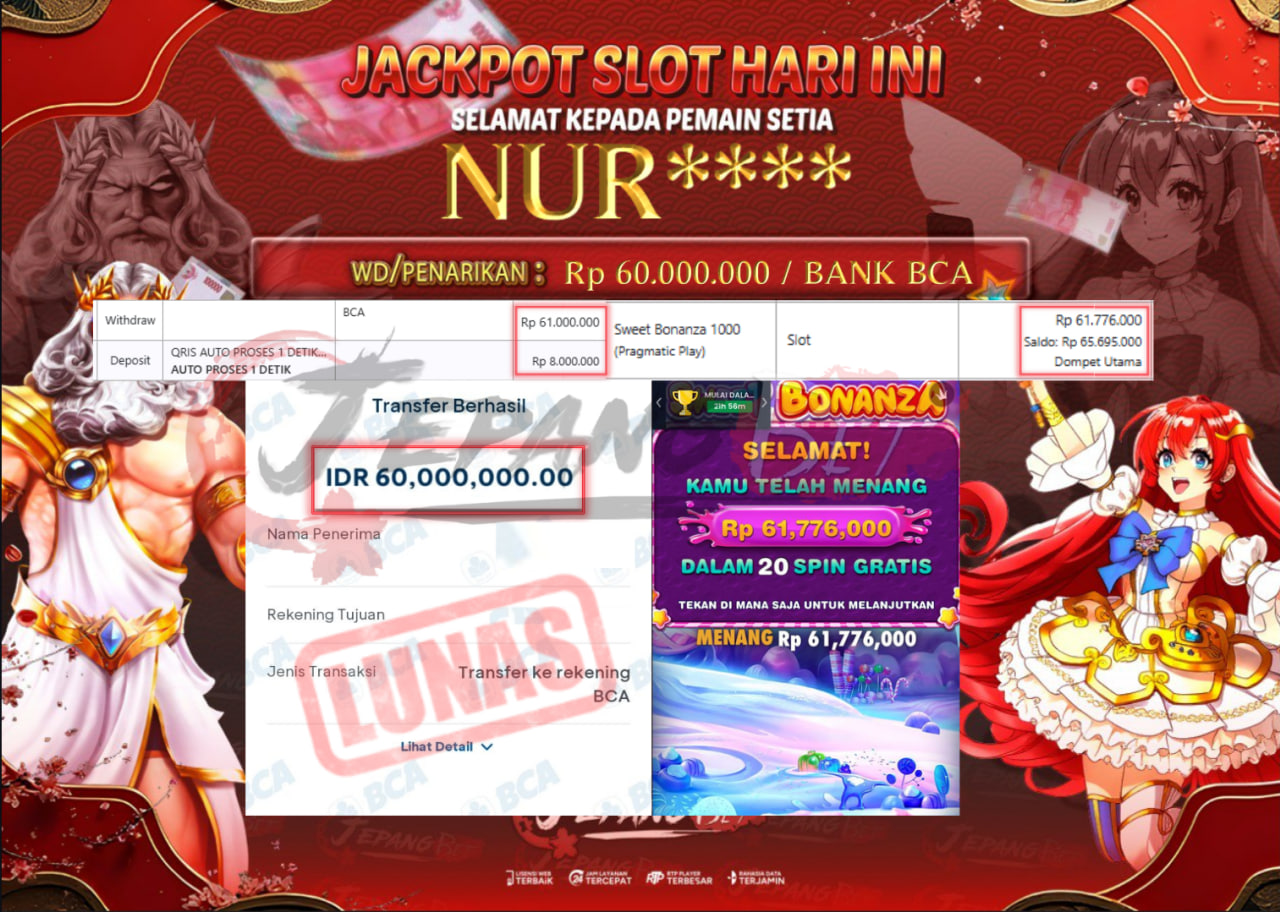 Bukti Lunas Jackpot Jepangbet adalah halaman resmi yang menampilkan dokumentasi pembayaran kemenangan para member. Di sini Anda dapat melihat bukti transfer dan tangkapan layar kemenangan dari berbagai game yang dimainkan.