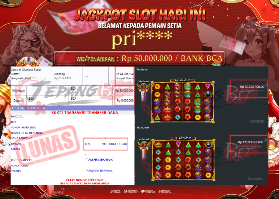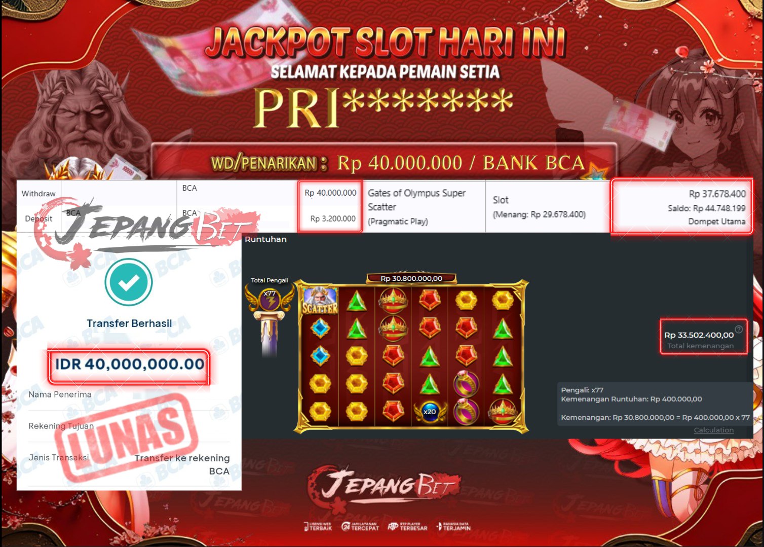 Bukti Lunas Jackpot Jepangbet adalah halaman resmi yang menampilkan dokumentasi pembayaran kemenangan para member. Di sini Anda dapat melihat bukti transfer dan tangkapan layar kemenangan dari berbagai game yang dimainkan.