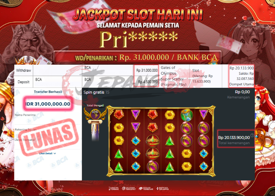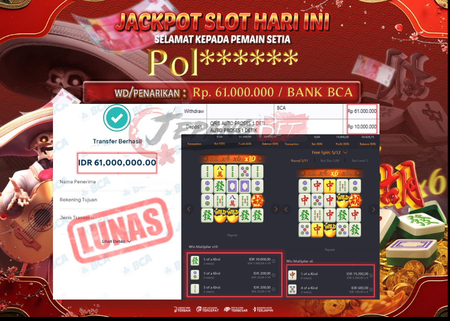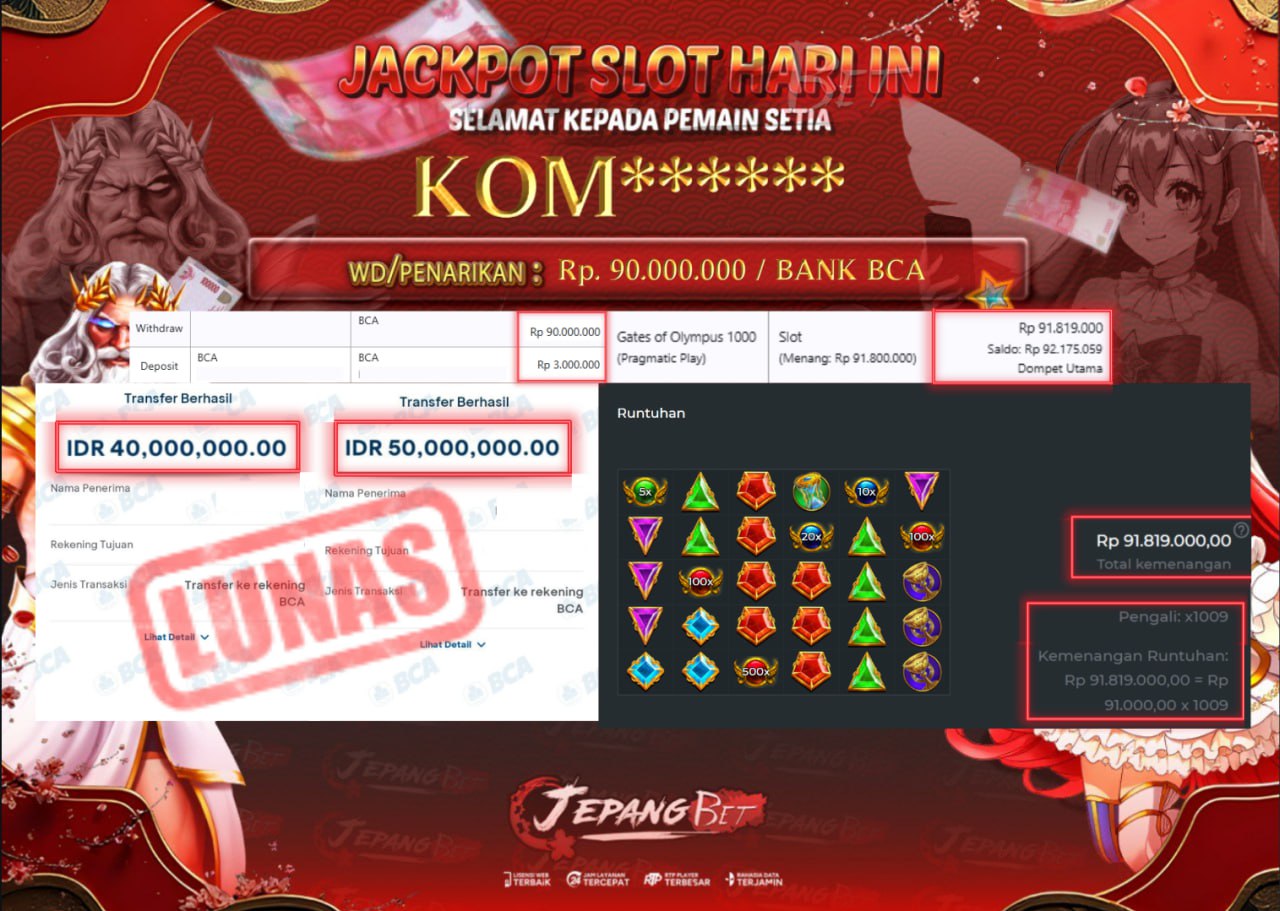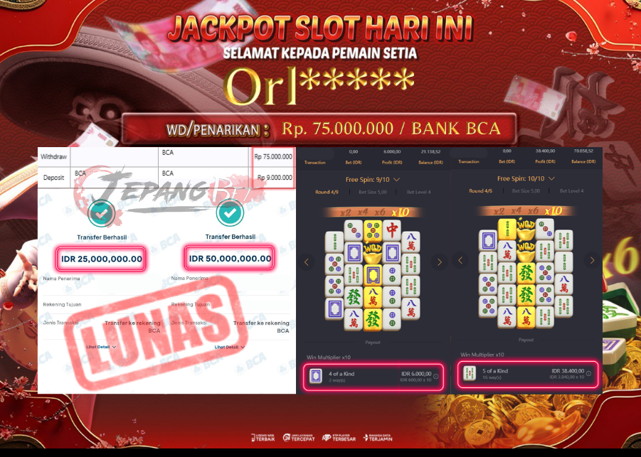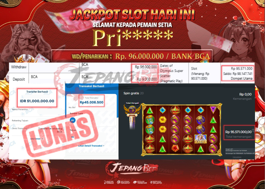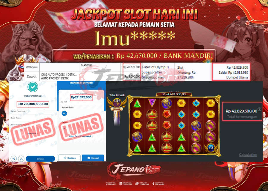 Bukti Lunas Jackpot Jepangbet adalah halaman resmi yang menampilkan dokumentasi pembayaran kemenangan para member. Di sini Anda dapat melihat bukti transfer dan tangkapan layar kemenangan dari berbagai game yang dimainkan.