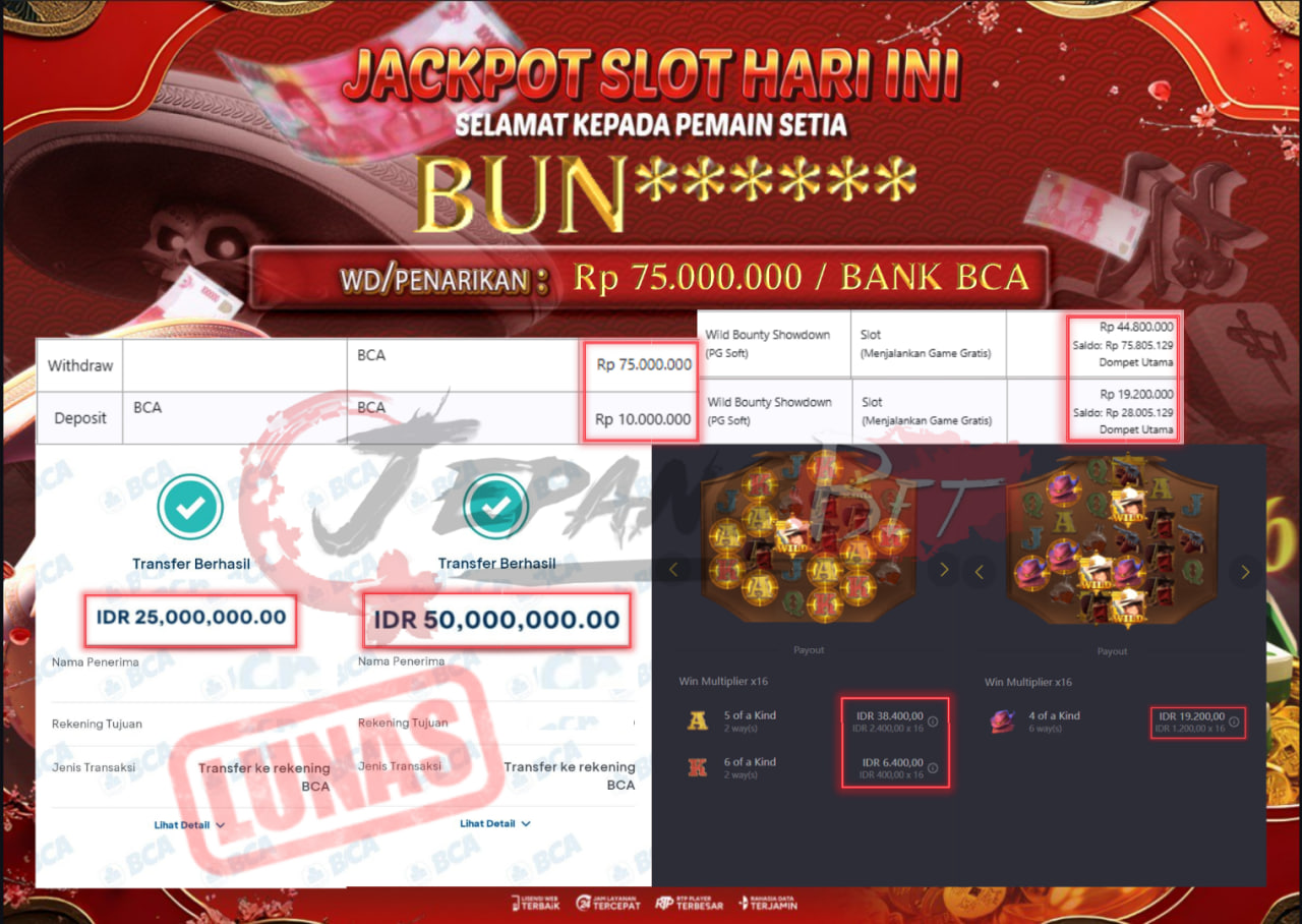 Bukti Lunas Jackpot Jepangbet adalah halaman resmi yang menampilkan dokumentasi pembayaran kemenangan para member. Di sini Anda dapat melihat bukti transfer dan tangkapan layar kemenangan dari berbagai game yang dimainkan.