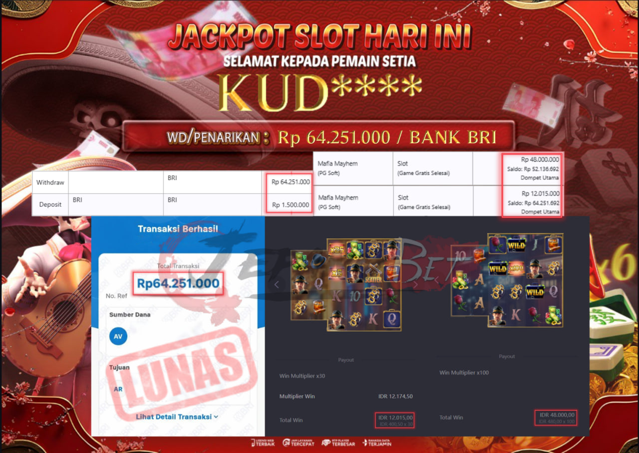 Jackpot Slot Mafia Wayhem Berhasil Dibayarkan Lunas Sebesar Rp 64.251.000.,- LUNAS