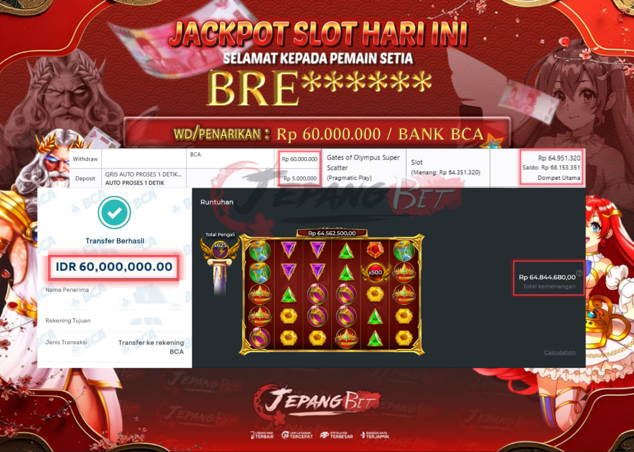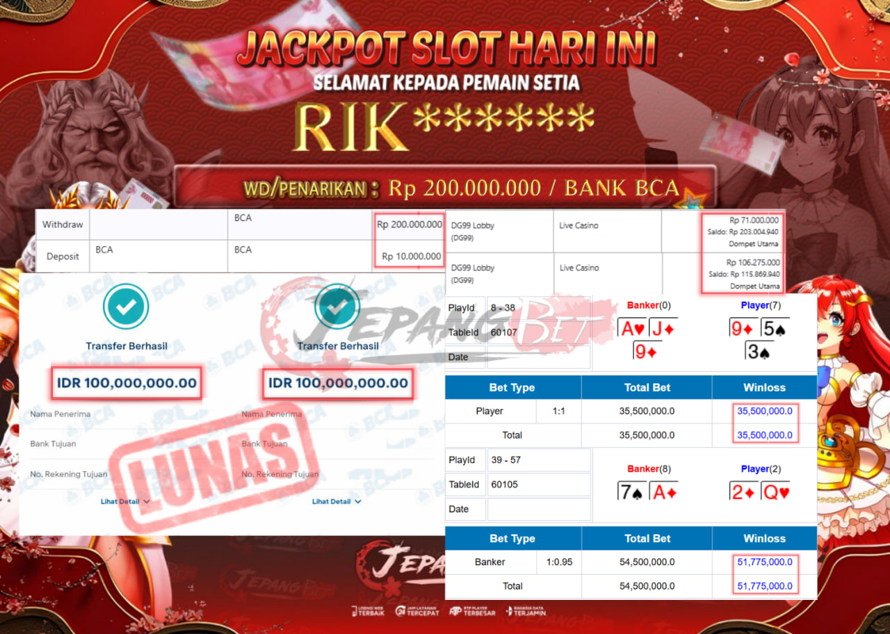 Bukti Lunas Jackpot Jepangbet adalah halaman resmi yang menampilkan dokumentasi pembayaran kemenangan para member. Di sini Anda dapat melihat bukti transfer dan tangkapan layar kemenangan dari berbagai game yang dimainkan.